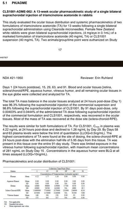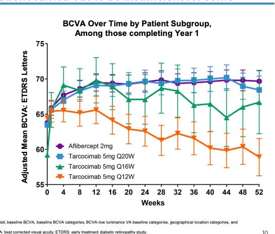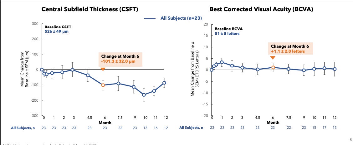 The CST and BVCA curves show the same trend as other TKIs, numerically slightly worse efficacy than aflibercept, but within error. So I have a theory: they need $ to fund a ph3 as an equal/slightly worse competitor with a weird dosing method. Clinical data is OKAY but not great, and SCS procedure has room to improve. But it ends up a 0.