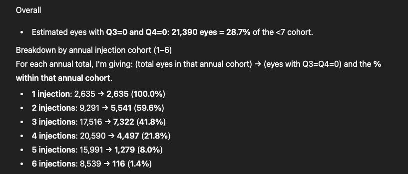 Plug in Mean, SD of injection frequency into chat GPT and ask for a distribution: approximately 40% of eyes with < 7 injections required < 4 injections in the year. This is a conservative estimate still. Because the distribution may vary. It’s not the Percent