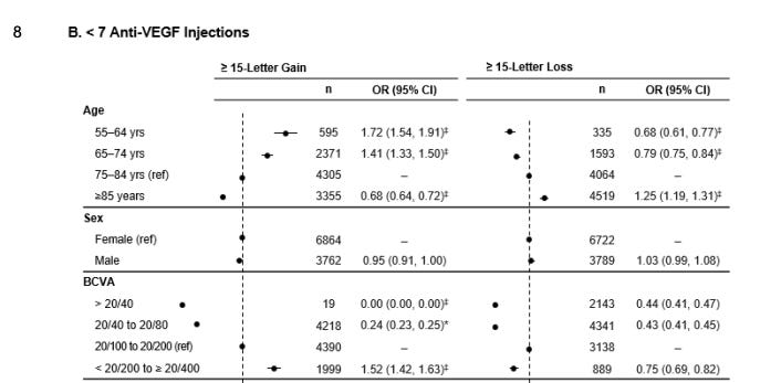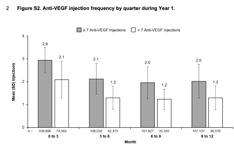 I think this real world data provides us information on the efficacy of eylea. First off, patients with better vision lose more vision, consistent with the prior data. The <7 anti-VEGF group is better suited for comparison to the SOL-1 population as they presumably require less VEGF suppression. (interesting there is minimal difference in baseline VA and requirement for injections.
