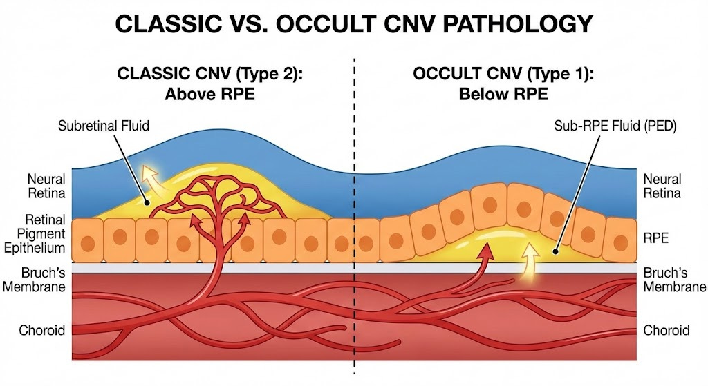 Wet AMD is classified into two main subtypes: Occult and Classic. Occult(Type 1) is when the CNV grows below the RPE and doesn’t break through. In occult wAMD the growth is contained under the RPE and progresses much slower. Historically patients with occult wAMD see less of an initial vision benefit after anti-VEGF treatment. Classic wAMD is the more aggressive and disruptive subtype. Classic CNV breaks through the RPE and causes much more structural damage. These patients see a much stronger visual rebound after initiating anti-VEGF treatment but are also worse off long term due to the structural disruption leading to photoreceptor death.