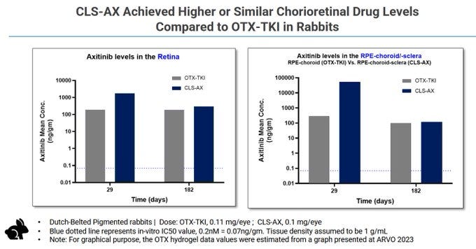 Before Ocular, Clearside biomedical tried Axitinib for wAMD. Clearside Biomedical developed a suprachoroidal space(SCS) depot of axitinib, but it didn’t match investor expectations. Clearside Biomedical’s clinical data wasn’t actually bad, but I think the complexity of this new SCS procedure made it a non-starter.