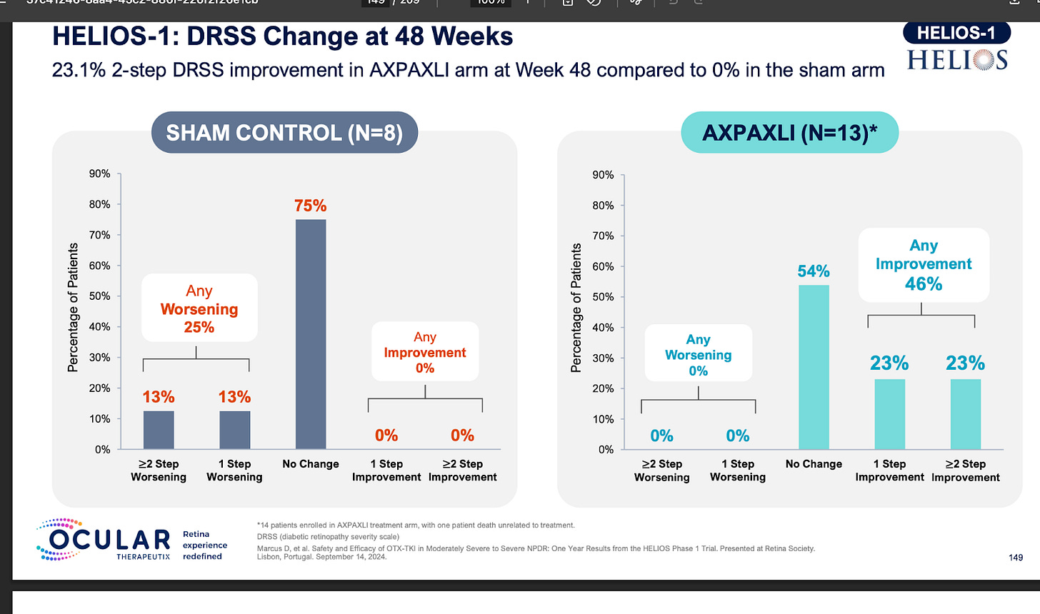 It is quite clear that TKIs < antibodies in NPDR. What is extremely interesting is that the Eyepoint NPDR data was far inferior to Oculars(though nothing like the Eylea Axpaxli gap). There seems to be no reason for this inferiority other than Duravu having worse long term VEGF suppression than Axpaxli, as both TKIs target the same important kinases for disease progression (If Duravu actually hit IL-6 you’d imagine it would beat Axpaxli in NPDR). It is of note that Ocular used the old SAB-1 formulation in their NPDR study.