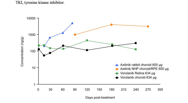 Furthermore, they’ve shown some preliminary data that dosing >>>>IC50 doesn’t matter (because they do not dose >>>> the IC50), but that paper has a host of issues: the CAM sponge assay doesn’t represent a real VEGF in the eye model and they’ve given 200x the amount of vorolanib compared to axitinib (because the IC50 is 200x less!). In the model, VEGF performs worse which we know is likely not true.