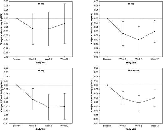 Here, the patients get one dose of Eylea, gain about .1logMAR (5 letters) and maintain out to week 12. In the 2mg group, we don’t see a return to baseline but we do see in the 1mg group return to baseline likely around week 20? Error bars too large to interpret and baseline is awful vision…..