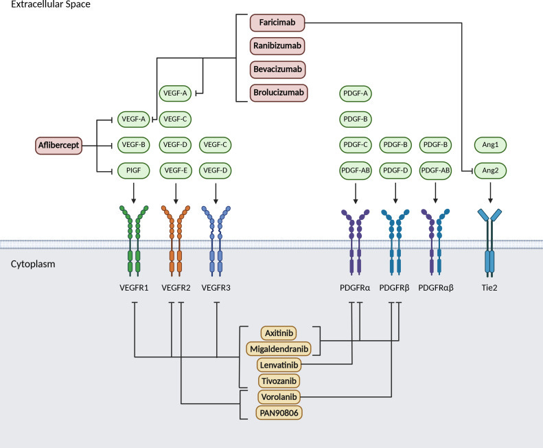 VEGF-A is the key target for Wet AMD. Since it has been proven to be the main promoter of growth, all efficacious therapies in wet AMD target it in some way. The main isoform in the eye is VEGF 165. This isoform is so important because it is both small enough to diffuse into nearby tissues, but large enough that it doesn’t quickly filter out of the eye. Targeting VEGF 165 alone has proven to not be efficacious enough to reverse disease progression, companies now opt to block all VEGF-A isoforms, as some such as 121 and 189 have shown the capability to promote strong growth.