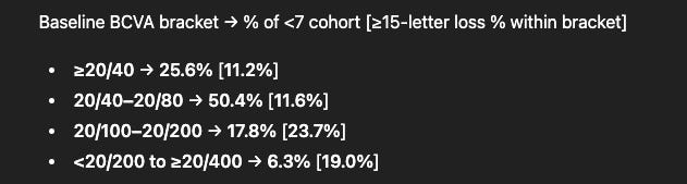 Further, the PK of eylea has an ~11 day half life in the eye. To be on the safe side, let’s assume it goes to 0 in 3 months. Now: assuming the drug is active for 3 months, and inactive for the next 6, using the sham controlled data, across multiple cohorts, only 35% would lose 15 letters! That’s an issue because 1) the stat sig is called into question (OCUL guided to 70% rescue rate in the Tx arm, 20% in the control arm) 2) what if we used HD eylea instead? But even in that case, the drug can still potentially be worth 1B-2B (i.e. flat stock price) as a foundational treatment with a longer dosing interval on the label.