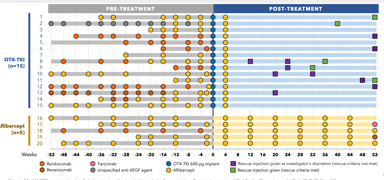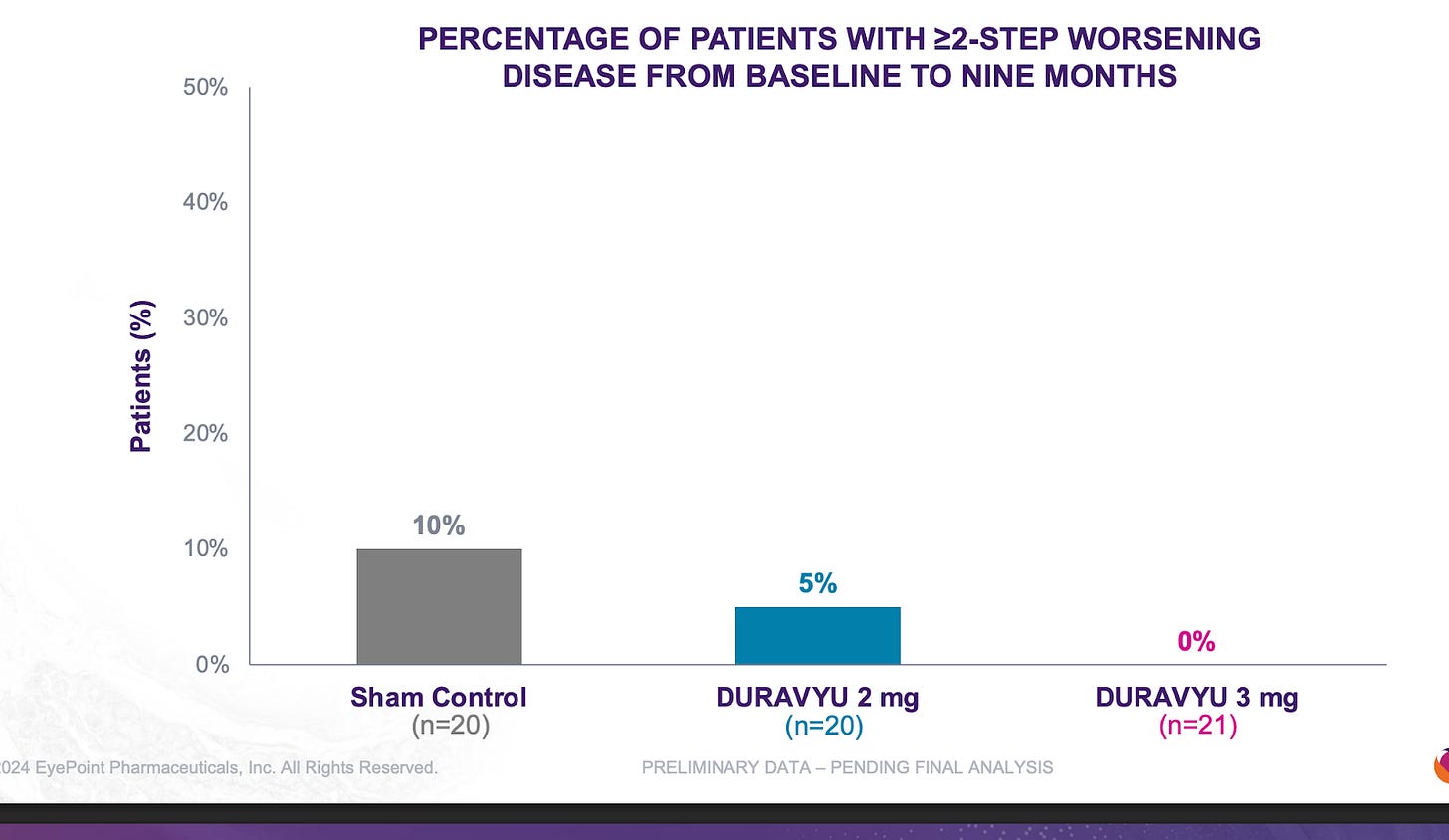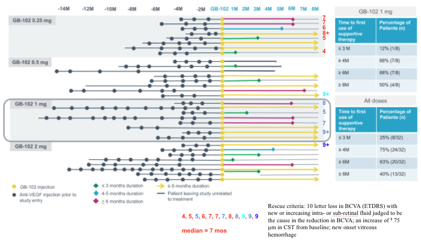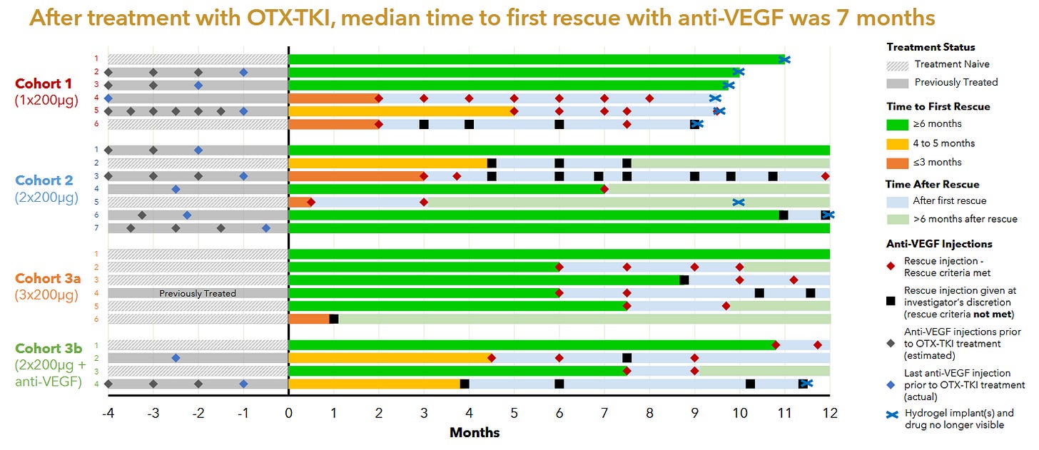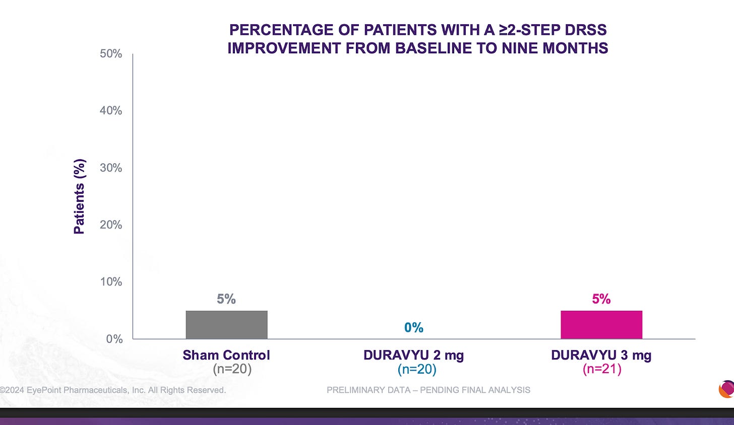 We’ve tried this before with graybug vision and Sunitinib: GB-102 was a formulation of Sunitinib that failed on safety (drug delivery issue) and also showed Meh efficacy. Safety failed because the drug leaked into the anterior chamber, had a DLT in the high dose group plus many IOP incidents. But efficacy failed pretty badly: rescues at 4 months and loss of vision. It’s a knock on the TKI thesis.