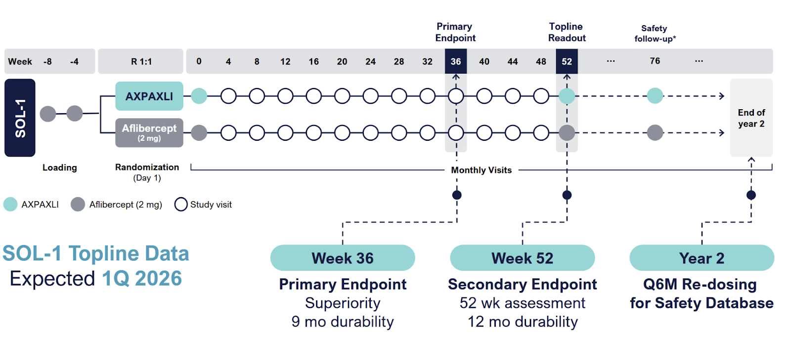 Delta becomes borderline statistically significant (say 63% vs 80%, delta = 15-20%). The stock will be punished moderately, because it opens the door for arguments that Eylea HD/Vabysmo would have outperformed Axpaxli in SOL-1.