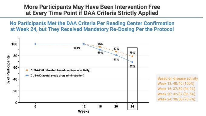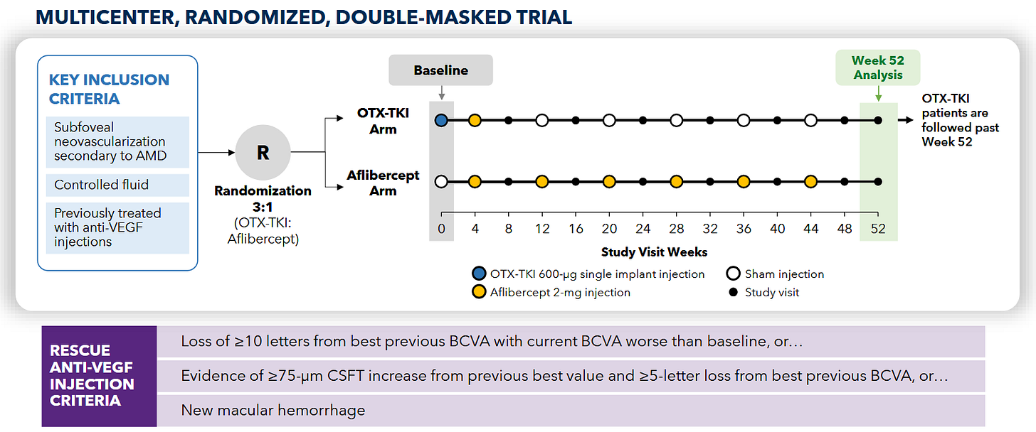 Patients get two loading doses, they HAVE to improve, then they get Eylea or Axpaxli, and they check for superiority at 9 and 12 months. They are selecting for patients who A) respond and have B) mild disease. We want to see if 1) these patients require less than expected VEGF (as TKI < VEGF) and 2) still require adequate rescues at 9 months based on vision loss. The primary endpoint is loss of 15 letters from the randomization baseline (note: it is the “peak” baseline after the patients respond to the two loading doses; not from the screening baseline; so essentially the primary endpoint is the gross loss of ~5 letters from the screening baseline).