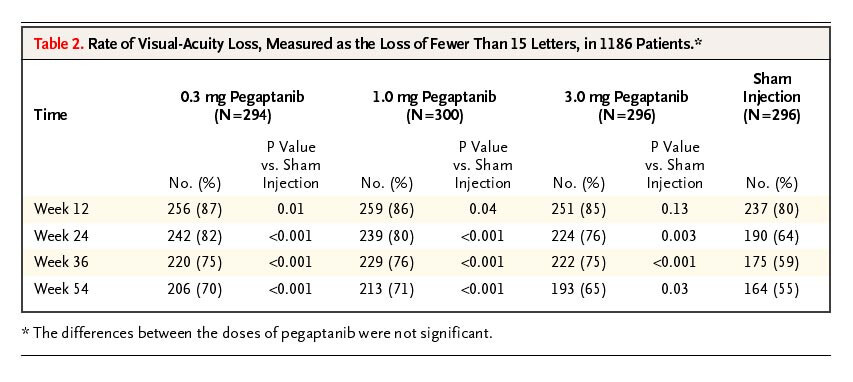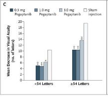 Pegaptanib - Overall 40% lose 15 letters in the sham at 9 months, 35% at 6 months. Likely higher in patients with > 55 letters at baseline.