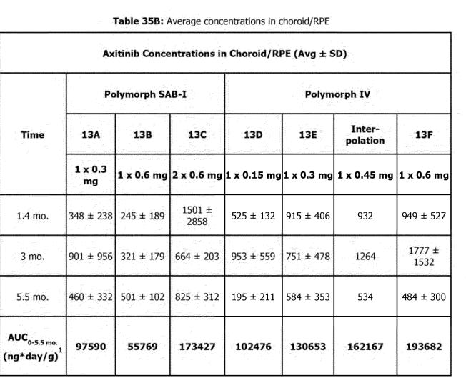 The NHP study continues to show that SAB-1 does not release enough drug initially after dosing and that the Form IV design allows for relatively stable concentrations of axitinib in retinal tissues. One crucial detail is that this study used a 300ug implant for the Form IV arm, and the current in human phase 3 studies use 450ug. Due to the design of the Form IV implants aiming for near constant rate release, this data indicates that the 450ug dose should last >7 months in the eye, and up to even 9 months.