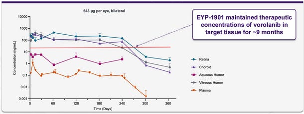 Axpaxli is an implant in development by Ocular Therapeutix which sits in the vitreous and secretes the TKI axitinib over ~9 months. Ocular is about to readout a pivotal phase 3 trial measuring how long Axpaxli prevents patients from needing a supplemental anti-VEGF injection. Axpaxli has the possibility of being approved for every 6-12 month dosing and decreasing the dosing burden for a large basket of patients. Based on trial design and Axpaxli’s preclinical data, it should remain efficacious until the primary endpoint at 9 months and convey impressive efficacy.