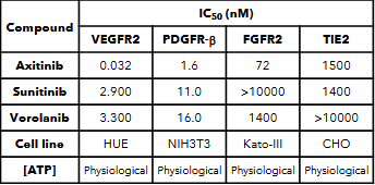 Historical literature on axitinib has indicated that its IC50 for VEGFR2 (KDR) is 0.2nM, although Ocular has shown in an in-house study that at physiological levels of ATP axitinib’s IC50 is 0.032 nM (below, I don’t have good intuition where they derived this IC50). Based on the bulk of independent studies, it’s reasonable to believe the IC50 against KDR is in the 0.2-1nM range. Very potent per se.