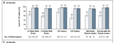 Ranibizumab vs Sham: baseline 53 letters, predominantly occult lesions. 63% of SHAM injection didn’t lose 15 letters at baseline