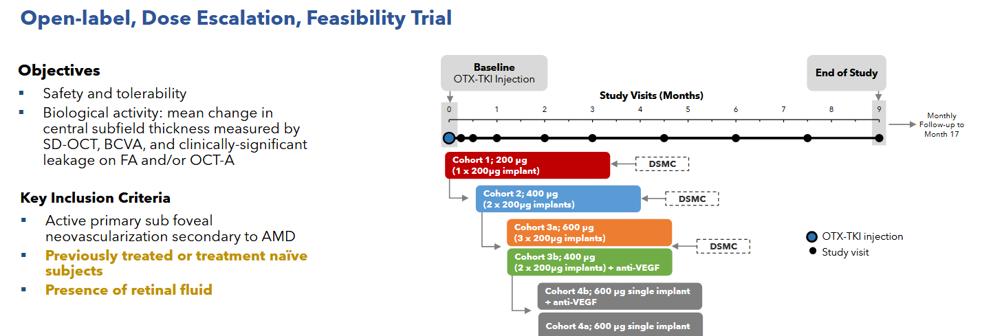 There was one case of intraocular inflammation in cohort 3b, it is unclear whether that was due to the Axpaxli or aflibercept injection. The company never released data from the fourth cohort in this trial, presumably the 1 insert of 600ug with the old formulation failed to control disease in these more aggressive disease state patients. It’s worth noting that even if the patients were much worse off and had active disease and no loading doses, we saw good signs of efficacy especially in the treatment naive population. In Cohort 3a 4 out of 5 treatment naive patients with active disease maintained a good status for >=6 months without rescue & without any loading anti-VEGF injections.