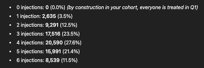 Furthermore, What % of the individuals receive injections only in Q1,Q2, none in Q3, Q4 (estimating those without a rescue later). This analysis does not reflect real world practice, It’s kinda nonsense. But I think it is still useful because it places a floor on the control arm. ~30% of patients don’t need a Q3/Q4 injection