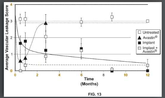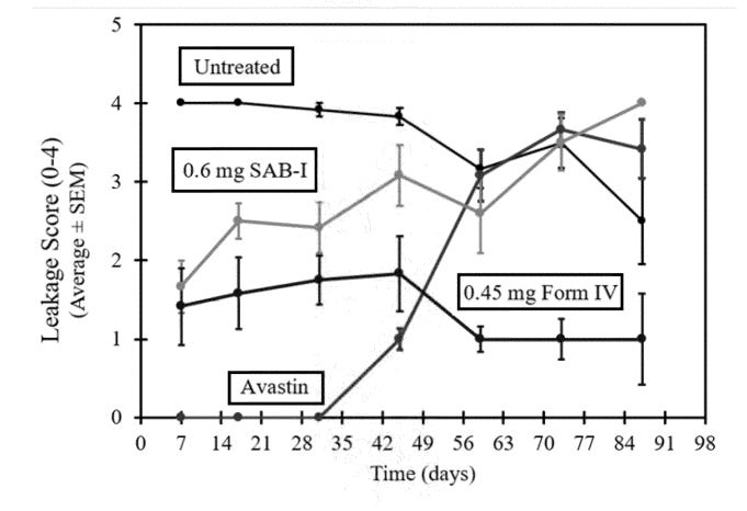 The theoretical benefit of the higher AUC and more consistent dosing was shown clearly in a rabbit VEGF challenge model. This model works by injecting a highly supraphysiological dose (1ug per eye, literally cancer causing dose) of VEGF into rabbit eyes and measuring vascular leakage. Form IV beat SAB-1 AND showed persistent control.