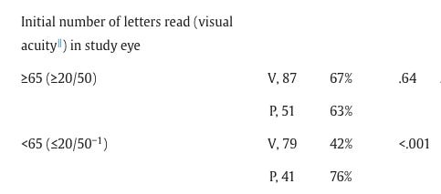 Patients in this trial were allowed to switch to PRN drug if disease activity was sufficiently suppressed. Here, consistently, patients with initial visual gains were able to extend the trial. Obviously confounded by how initial gains allow patients to maintain the gains, but 80% of patients with initial 3 letters were able to maintain it with VEGF treatment. If you can suppress these patients and they gain letters,they’re likely to maintain that gain. And this is maintaining 15 letters of vision, not prevention of loss. +1 for easier to treat population