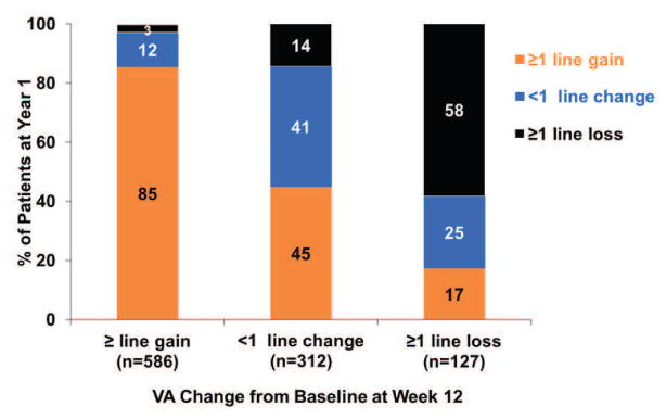 Ranibizumab - 50% >55 letters lose 15 letters at 12 months