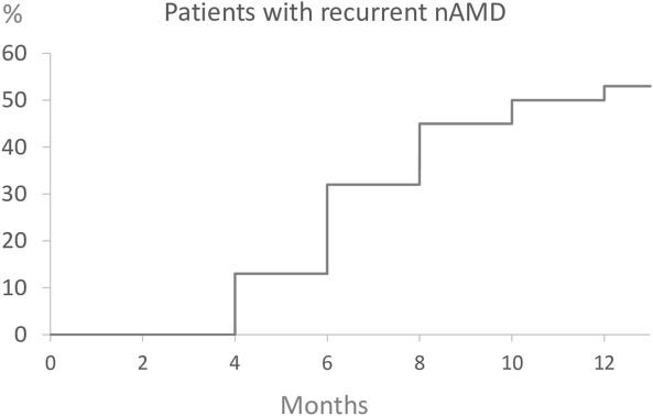 Patients with treat and extend therapy are monitored for a few months after stopping therapy. Patients with AMD were treated with 3 monthly injections and then followed in a TEregiment with extensions by 2 weeks. Patients reaching 12 weeks WITHOUT any disease activity on 3 consecutive visits were eligible. Then we track for recurrence.