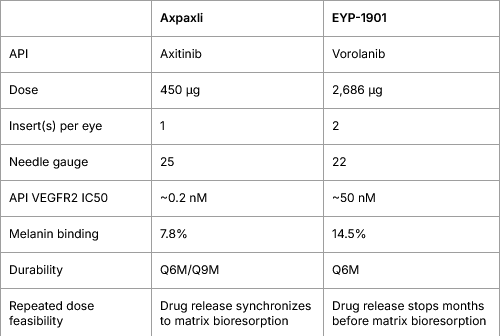 From a TPP perspective, Axpaxli will supersede EYP-1901 by a margin, if both hit the phase 3. One less discussed strength of Axpaxli is the needle required for the procedure. EYPT’s is evidently larger thus introducing more pain and inheriting more risks from the procedure. Number of inserts is also an important consideration in which 1 insert/eye will minimize the vision distraction while streamline the repeated dosing (e.g., what if 2 inserts don’t synchronize well? re-dose or not?)