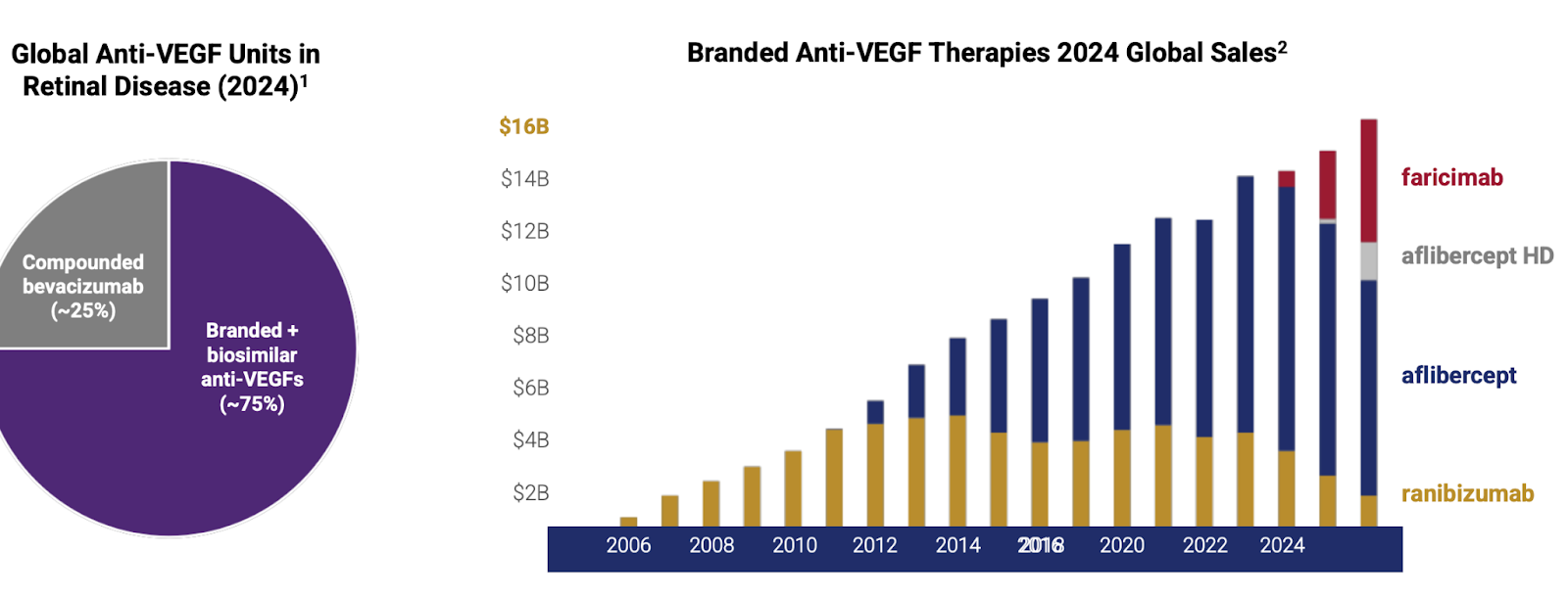 In 2004 the FDA approved Pfizer’s Macugen(pegaptanib), the first ever anti-VEGF for wet AMD. Macugen targeted the VEGF-165 isoform and showed a slowing of vision loss in patients of all subtypes of wAMD. Quickly after Macugen was approved, Genentech showed incredible data with their pan-VEGF-A fab, ranibizumab, demonstrating the ability to both shrink CNV’s, as well as meaningfully improve vision in patients with wAMD with Q4W dosing. Ranibizumab was approved in 2006 with the brand name Lucentis, and became a blockbuster in 2009 in the United States(Novartis held Ex US commercialization rights). Lucentis was able to achieve this market success despite competing with off-label Avastin, as quickly into the launch doctors realized they could substitute Lucentis with compounded Avastin at a much lower cost.